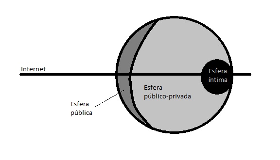Esta imagen representa la disposición de los ámbitos de la vida que propone Zafra. Si bien para ella no existe per se una esfera privada, permanece supeditada a la esfera pública de la cual no llega a separarse del todo. La pública, siendo una parte externa a nosotros (desde un solo individuo no se genera esta esfera), penetra directamente en nuestra forma de ser y nos moldea para ubicarnos en sociedad y actuamos hacia el afuera. Si contamos con Internet, que atraviesa todos los aspectos de nuestra vida, la esfera privada se disuelve. No es fácil distinguir el límite de lo público y lo privado porque la sociedad red nos saca hacia afuera. Si hace décadas, cuando las calles se llenaban por doquier de cámaras CCTV era temido ese fin de la intimidad, hoy la mirada ha dejado de temerse. Hoy nos aterroriza dejar de ser visibles. No aparecer en redes sociales, no mostrar lo que se hace, equivale a la desaparición.