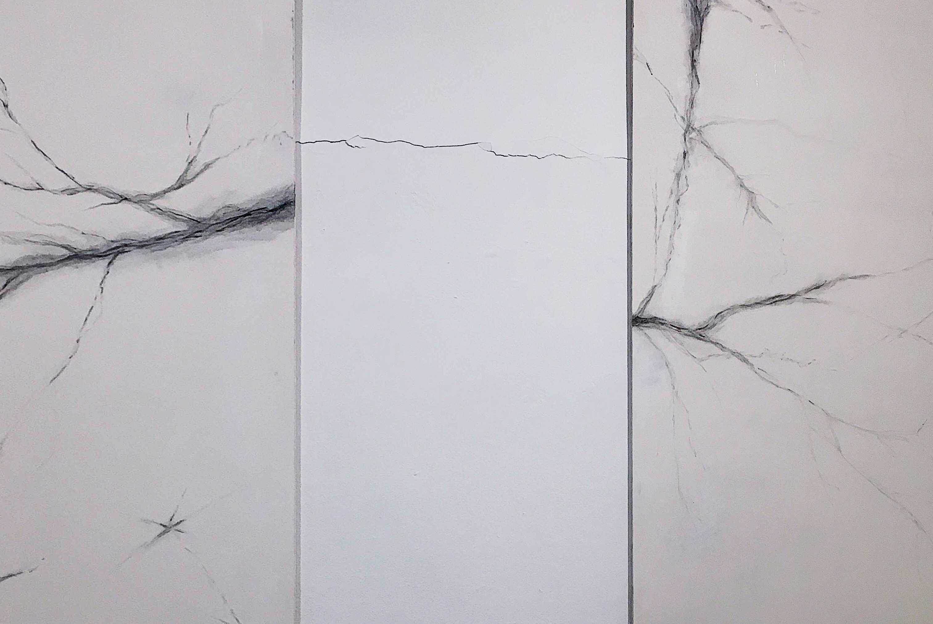 Algo que parece una veta en el mármol coincide con una veta/grieta real. El valor simbólico y cultural del mármol es indesligable de su lugar destacado en La Historia del Arte, eso también está ahí. La materialidad del panel remite a las esculturas romanas que fueron copias de las griegas, a la centralidad del mármol en la pintura y en la escultura del renacimiento, a su valor comercial por durabilidad, a la fetichización de los objetos realizados con esta piedra.
